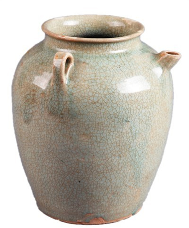 梅縣水車(chē)窯是粵東地區(qū)著名的青瓷窯,創(chuàng)于初唐,盛于中晚唐,其產(chǎn)品曾沿著海上絲綢之路遠(yuǎn)銷(xiāo)東南亞和西非地區(qū)。水車(chē)窯青瓷是客家先民的日常生活器物,器型豐富,質(zhì)量精良。唐代青釉雙系壺是館藏水車(chē)窯瓷器中的代表作品。此壺胎色呈灰青色,胎質(zhì)堅(jiān)硬、厚實(shí)。微侈口,短頸,雙豎耳,肩部飾雙系及一短嘴流,平底。外形穩(wěn)重壯實(shí),是水車(chē)窯最具山地特色的造型品種之一。除足底外通身施釉,青釉純正,釉質(zhì)類(lèi)冰似玉。