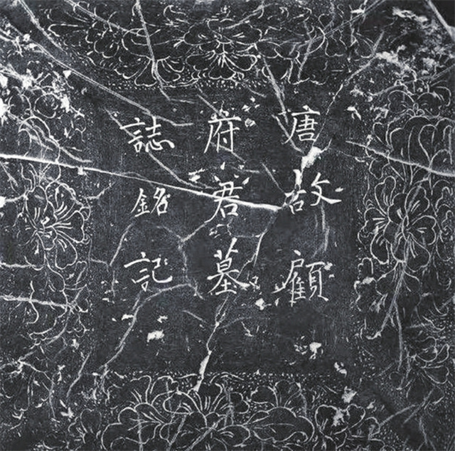 墓志的志蓋上刻有“唐故顧府君墓志銘記”九個字,為唐楷,稍帶魏碑風格。有別于一般墓志銘蓋上的八字,多一“記”字,這是很罕見的現象。另外“記”字書寫方法也比較特別,在唐代非常少見。墓志銘書法精美,均為小楷,帶有魏碑遺韻,勁挺含蓄。