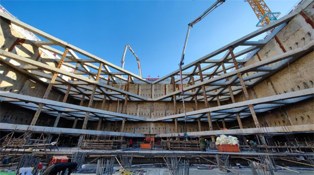 施工現(xiàn)場,已經(jīng)完成的主體結(jié)構(gòu)表面高低錯(cuò)落,讓人感覺起伏多變,劉杰介紹,地面起伏多變其實(shí)是“反梁”工藝,是為了保證地下屋面的順滑流暢,將原本需要向下突出的橫梁改為向上突出,呈現(xiàn)出表面標(biāo)高復(fù)雜的情況。由于未來地面僅有2000平方米的配套建筑,其余都是綠化景觀,“反梁”的設(shè)計(jì)既實(shí)現(xiàn)了地下效果最優(yōu),也避免影響地面景觀。
