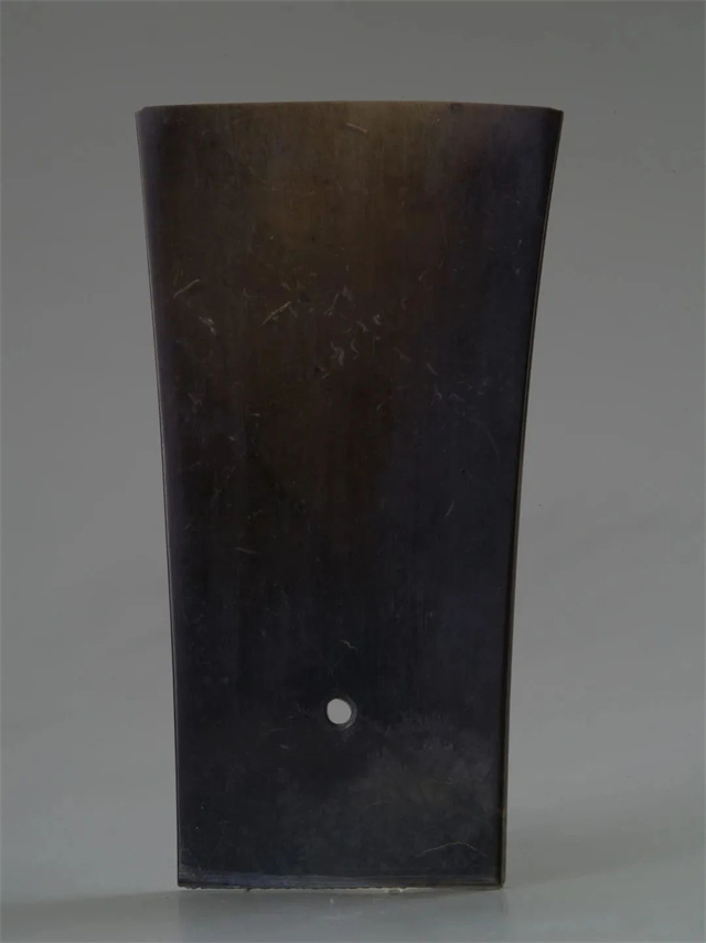 其中,展出的一件玉鉞材質(zhì)是深綠色透閃石玉,最薄處的厚度僅為0.7毫米,是國內(nèi)目前已知“最薄的史前玉鉞”,充分體現(xiàn)了石峁玉器高超的切割打磨工藝,目前專家對于該玉鉞的加工方式尚無定論。玉鉞出現(xiàn)于新石器時代至商周時期。這類形狀似兵器的玉器,一般稱之為“玉兵”。在此時期,玉兵主要作為一種禮器,是彰顯軍權的象征物品,而并非用于砍殺的實用器。在石峁城墻中常有玉刀、玉鉞、玉鏟等薄片帶刃玉器,這就是考古界所說的“藏玉于墻”,葉舒憲先生認為這種現(xiàn)象正是“瑤臺玉門”的表現(xiàn)。