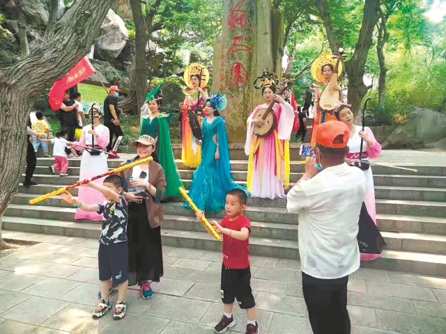 水簾洞前,瀑布飛練,演奏員們專業(yè)的演出讓游客駐足欣賞,掌聲不絕;玉女峰頂,遠山近海,演奏員們矗立巨石疊壘中,樂音空靈,游人恍如置身天宮——這是江蘇女子民族樂團在花果山上演出文旅劇《樂見西游》的一幕。